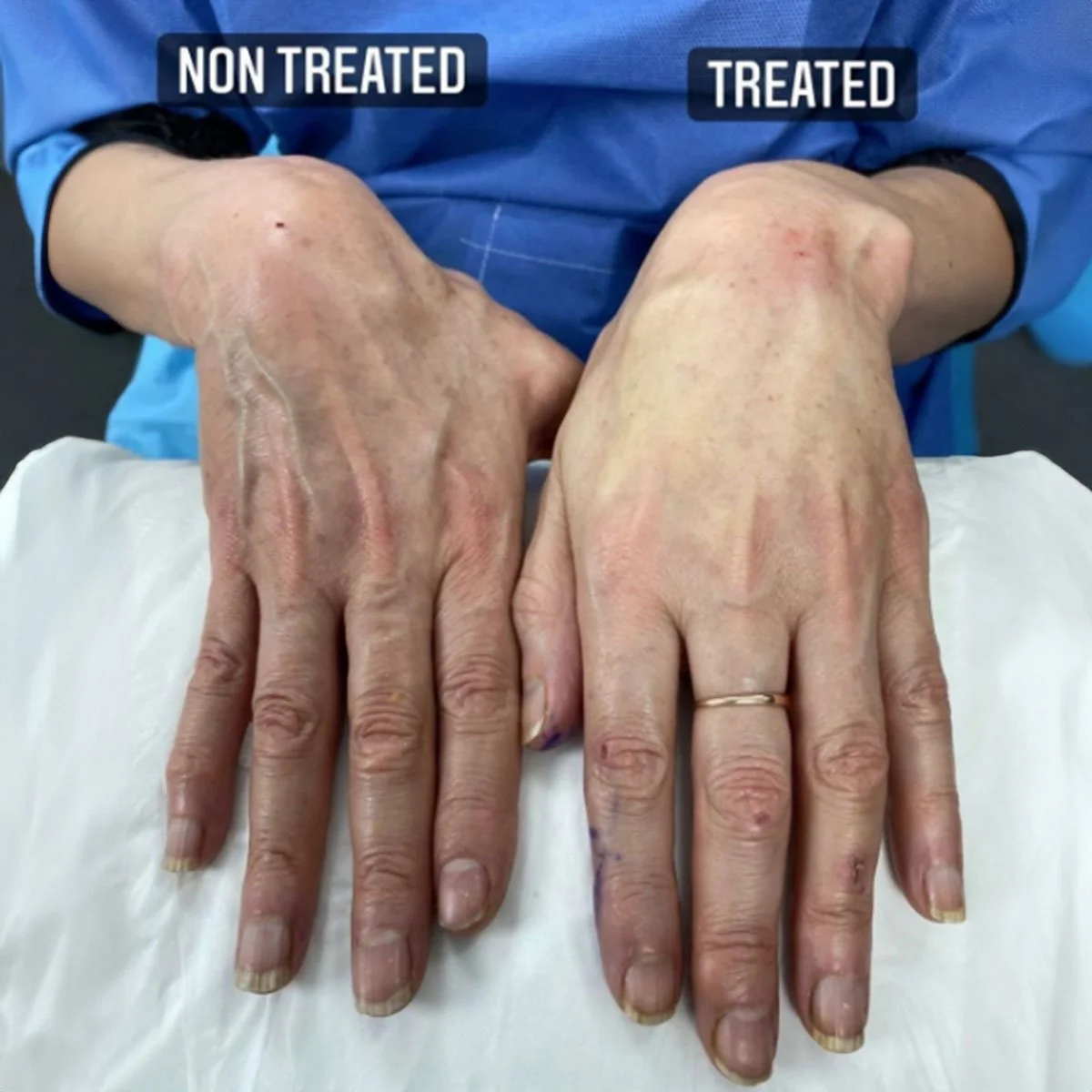 Hands are notoriously difficult to treat with their complex structure and number of tendons and muscles, so require specialist experience. This procedure can be very effective when combined with resurfacing lasers and needled radiofrequency.